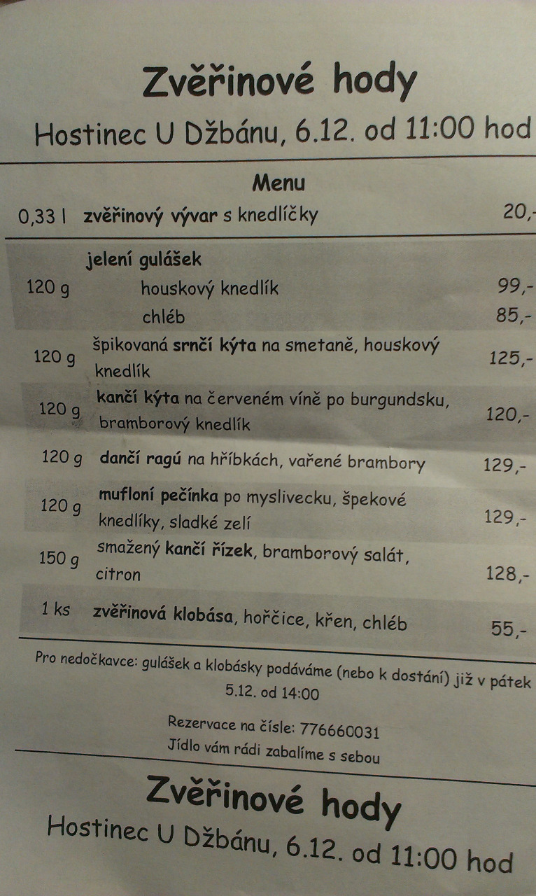 v sobotu 6.12. mezi 17:30 - 18:30 se uskuteční předvánoční klání ve futsalu, následuje přesun účastníků - sezonních abonentů futsalu do restauračního zařízení ke Džbánu, kde se budou v salonku podávat zvěřinové pochoutky a dobroty a to od 19:00hod odpoledních do pozdních hodin večerních. Nedělní futsal 7.12. je z důvodu následného totálního vyčerpání ZRUŠEN a též z důvodu, že naše stará těla pak v práci po double zápasu bez potřebné regenerace strašně trpí! Prosím o potvrzení účasti a nahlášení 2 jídel o která máte zájem (favorit a náhradní). Vybereme 2 nejčastěji se opakující jídla, abychom vyšli vstříc co největšímu počtu sportovců a hostiteli :) Výběr jídel musí být nahlášen nejpozději do neděle 30.11., aby mohlo být zakoupeno, připraveno a hlavně aby se nám ty čuňárny pěkně uležely! Pokud by vadila zvěřina, tak je možno si obědnat cokoli ze stálé a nebo speciální nabídky. Jídelák a finální stav stav je viz níže.